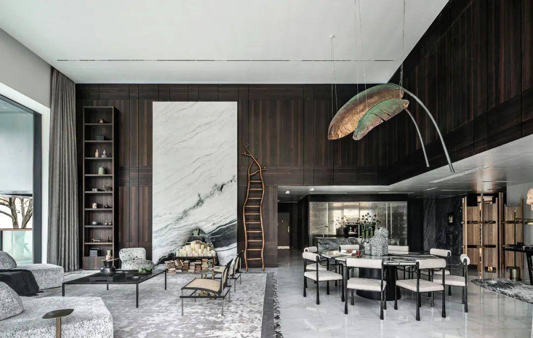 客厅这块6m的背景墙,人称“熊猫白”,纹理黑白交错,俨然巨幅水墨画。据说该石材由选材团队花费2个多月寻求多个省份,最终在福建水头找到它,从最初的22吨荒料通过3D切割以及人工打磨成为现今的“楼王”亮点,真可谓万里挑一;不仅如此,样板间内所运用的木饰面全部来自意大利的天然木品,通过手工拼接、烟熏处理才达到如今的效果和质感。