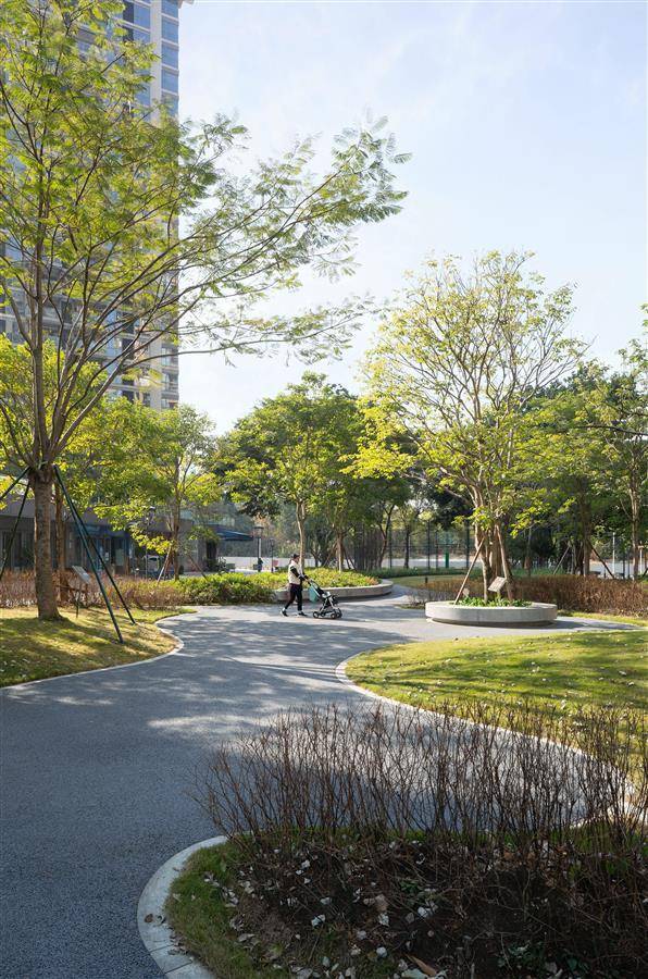 社区生活轴打造邻里交流舞台,针对儿童、老人、青年等不同年龄层群体,设置儿童乐园、休憩亭廊、康养花园、运动空间等丰富多样的功能活动载体,形成具有健康关怀和社交关怀的公共场所。