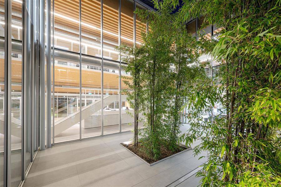 建筑中央设置充满活力的绿色庭院,种植易各类乔木和灌木,带来四季的风景,同时提高空气和办公环境质量,提升员工的幸福感。中央庭院作为建筑的绿色缓冲区,形成微气候,节约了被动室内降温所需的能源。