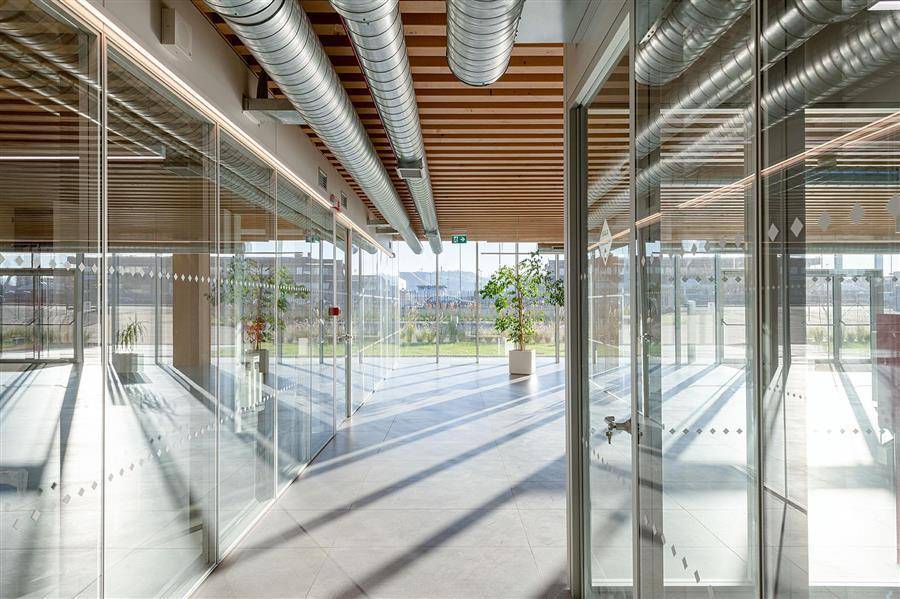 外立面为全玻璃幕墙,契合了Iperceramica开放、高效的企业文化,人们在室外就能欣赏到室内的工作环境,以欢迎的姿态迎接客户来体验建筑。