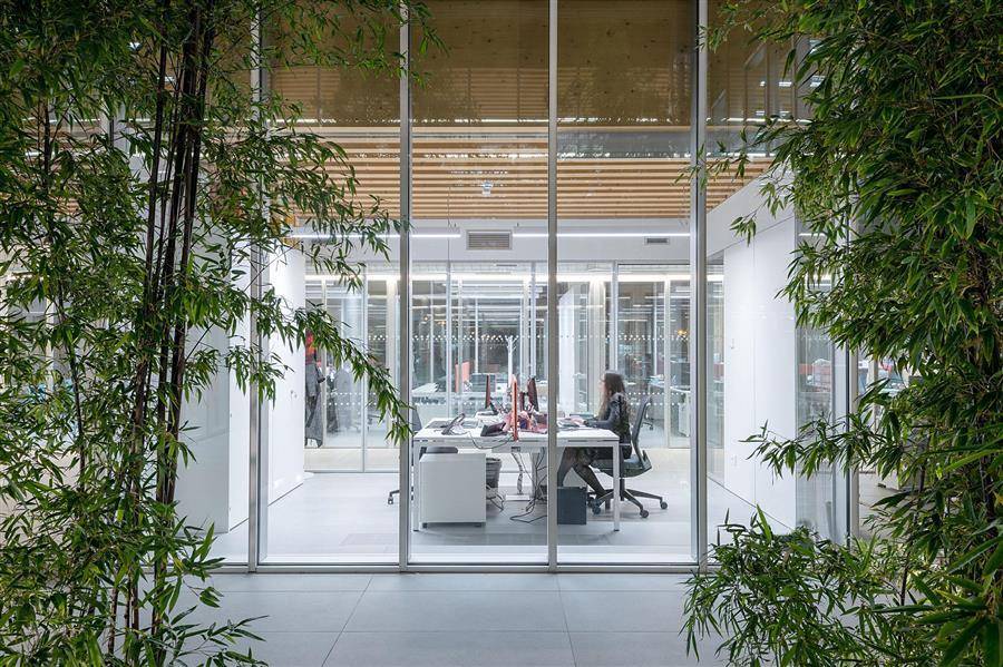 承重结构采用层压木材的预制构件,天花设置一系列约12 x 12 厘米的板条。通透的空间和木制结构清晰地展现在眼前,演绎木材的温暖美观。全玻璃的幕墙延伸至每个楼层,使自然光得以穿透建筑深处,创造高质量的室内环境。